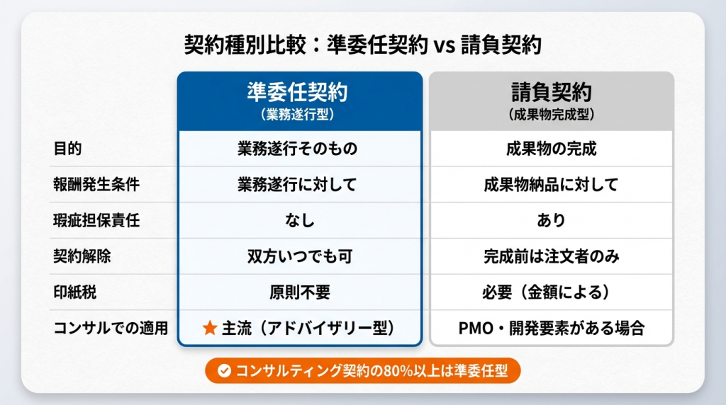 コンサルティング契約は「準委任契約」に分類されるケースがほとんど。成果物の完成ではなく、助言・支援という行為そのものが契約の対象です。
