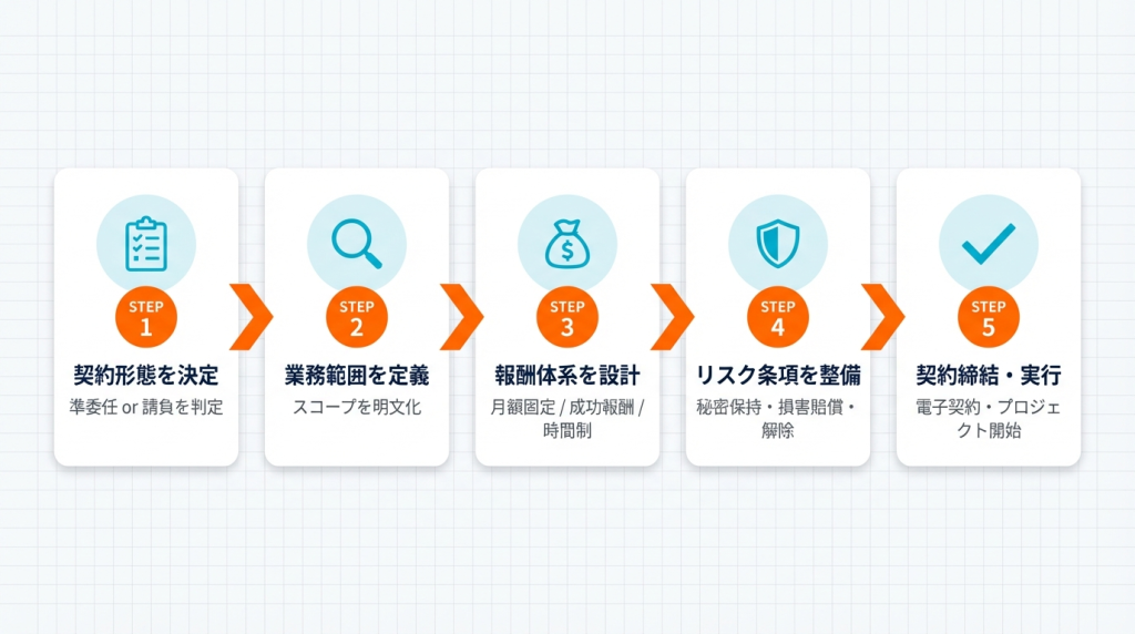 テンプレートをダウンロードしたら、次は作成の手順を確認しましょう。コンサルティング契約書の作り方は、大きく5つのステップに分かれます。
