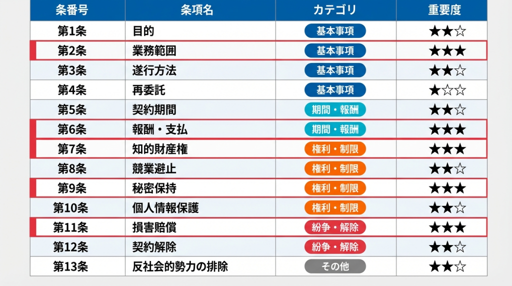 ここからは、コンサルティング契約書に盛り込むべき全13条項を、条文例とあわせて解説します。