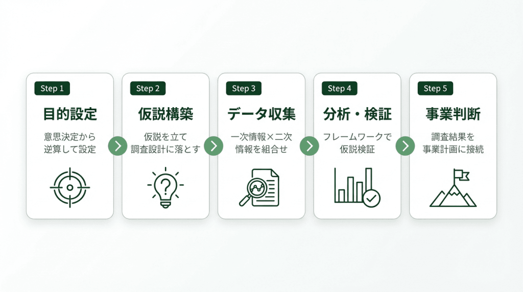 ここからは、新規事業の市場調査を具体的にどう進めるかを5つのステップで解説します。大切なのは「完璧な調査」を目指すことではなく、意思決定に必要な精度を最短で確保することです。